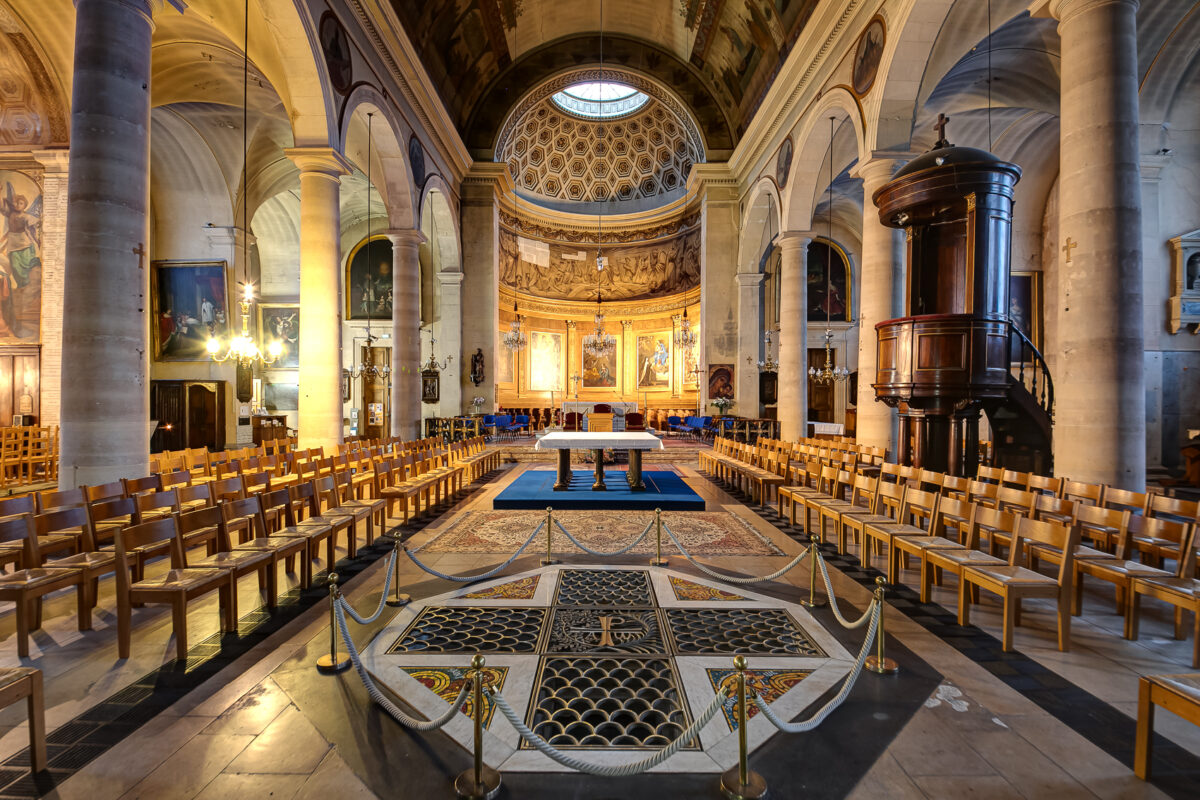 Notre-Dame de Bonne-Nouvelle was built on the basilica model of Saint-Philippe du Roule by the architect Chalgrin in 1830. It has replaced a building inaugurated by Anne of Austria in 1626, from which only the tower remains. It has been provided with many works of art spared during the Revolution, among which a painting by Philippe de Champaigne and another two attributed to the brothers Mignard. It has been entrusted the chasuble used for the celebration of Louis XVI’s last mass before his execution. Its modern baptistery allows baptism by immersion, particularly at Eastertide and Whitsuntide.